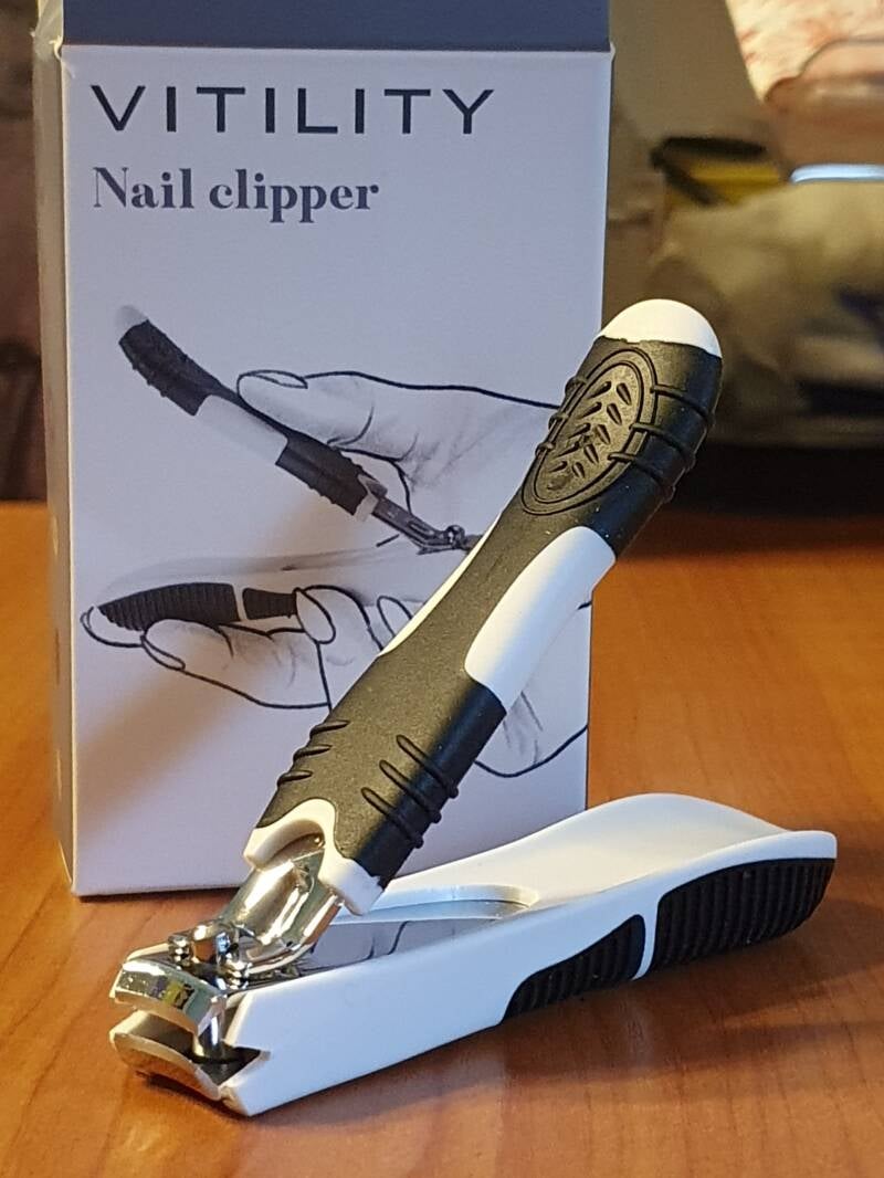 Wat een heerlijke nagelknipper kocht ik van Totale Zorgwinkel! Na jaren behelpen met een stugge Bol.com-knipper die voortdurend van zijn prutsplateautje gleed, is deze Vitility Nail clipper een schot in de roos. Officieel is hij voor reumatische handen bedoeld, maar na éen nagel wist ik het al: dit ding is helemaal geknipt voor verzwakte vingerspieren bij ALS. En dat voor maar zeven euro.