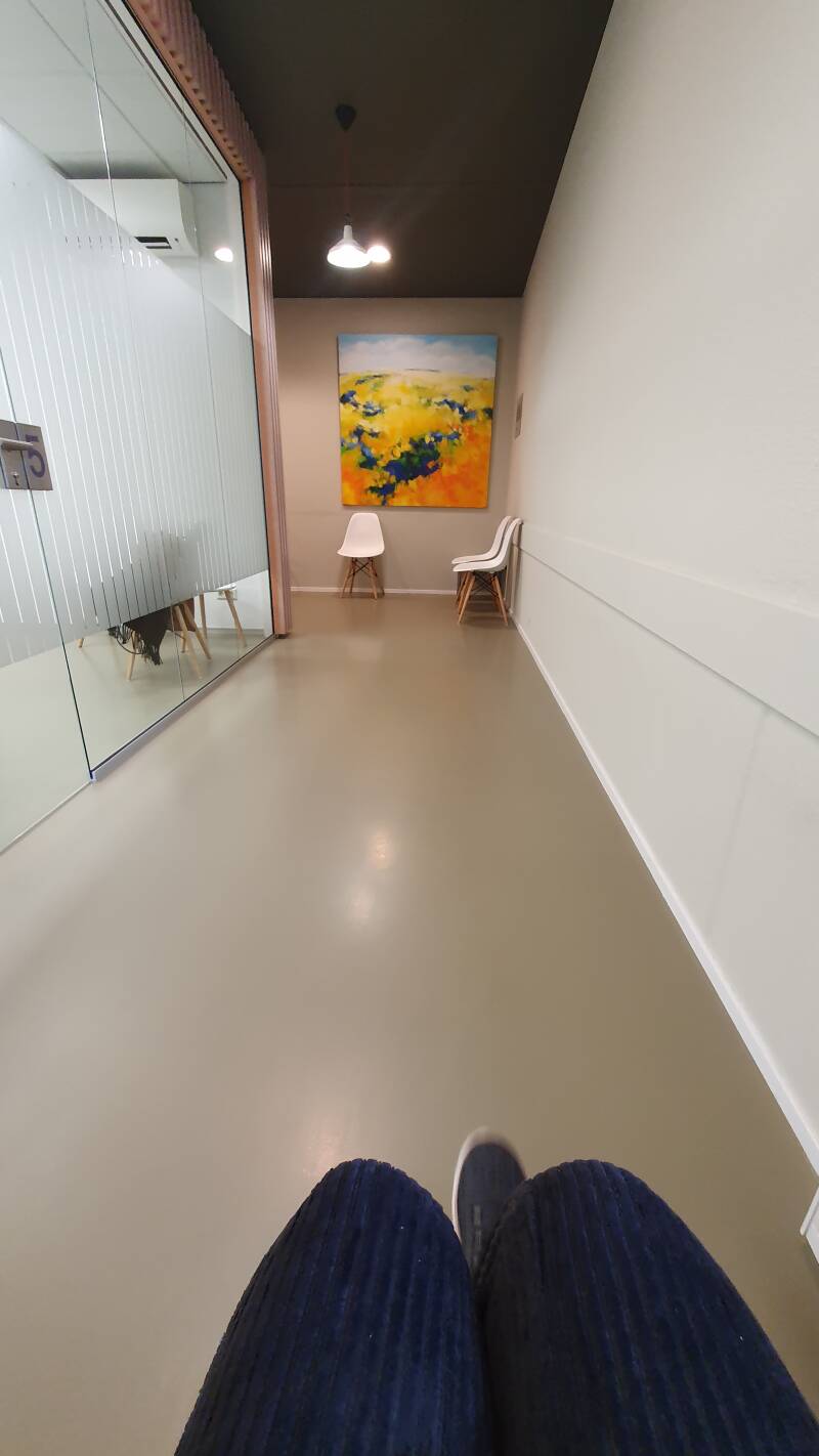 Bij de tandartspraktijk aangekomen laat de jongeman me in de lift naar de vierde verdieping achter. Boven aangekomen - achterwaarts zonder uitkijkspiegel - maak ik, gewapend met mijn vooraf klaar gezette tekst op de Spraakassistent-app, de baliedame duidelijk wie ik ben en waar ik voor kom. "U mag wel verder eh... rollen." Zo gezegd, zo gedaan. Ik glimlach naar de mede-rolstoeler in de wachtkamer en hij groet terug - zo gaat dat als rolstoelers onder elkaar, je hebt toch een soort verwantschap - en trippel langs de wachtkamer de lange gang in. Aan het eind staan een paar stoelen waar ik een beetje asociaal voor parkeer. Gehaald, overwinning twee! Even later komt er een man naast me zitten die naar zijn met stof en verf en opgedroogd cement bevlekte kleding te oordelen rechtstreeks van de bouwplaats komt.