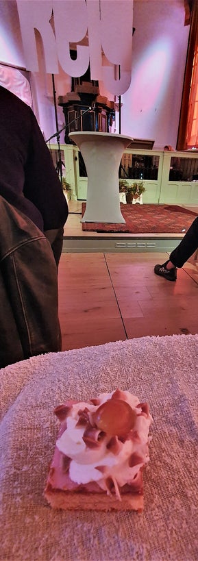 Voor de 'afterparty' maken intussen gearriveerde Man en ik de oversteek naar de kroeg tegenover de kerk. Kom ik toch nog even op dat terras. Zo'n receptie is doorgaans een uitgelezen gelegenheid om onder het genot van een consumptie een verscheidenheid aan ruggen en achterwerken te bestuderen. Terwijl ik de mensen vanuit rolstoelperspectief zit te observeren, komt er een bloglezeres naar me toe met een verholen opdracht: je schrijft leuke stukjes, je wint het Frysk Diktee; als jij er nou eens voor zorgt dat er hier volgend jaar op zijn minst één vrouw tussen de winnaars staat...?