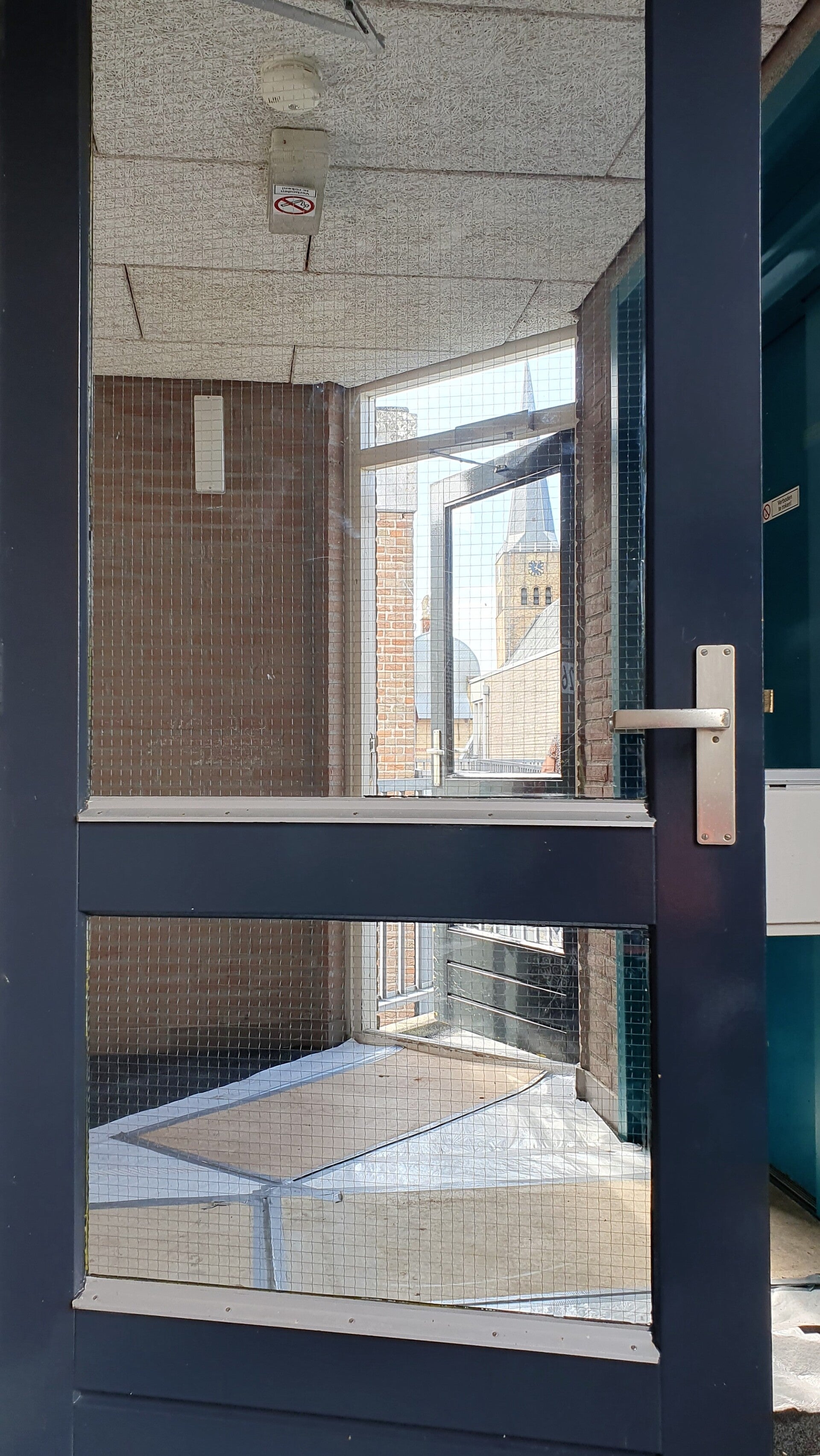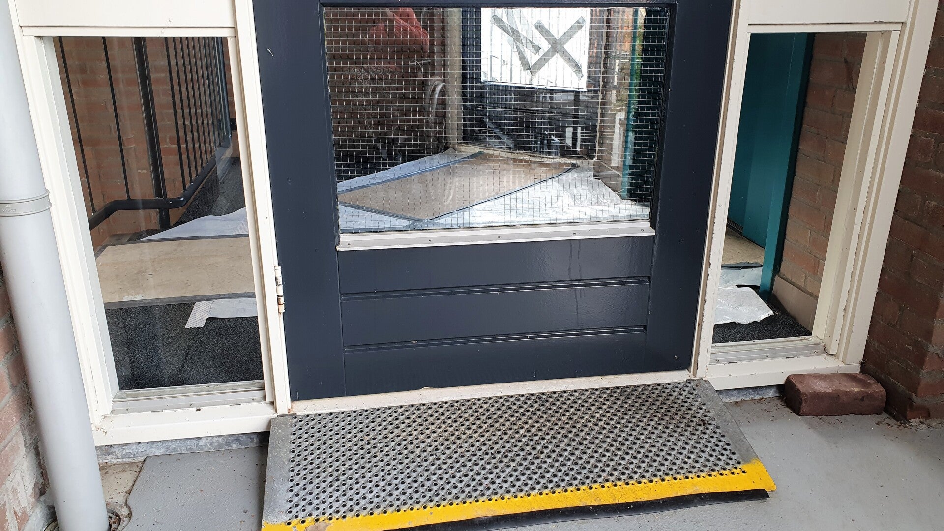 Het massieve betonblok tegen de deur staat de doorgang met de rolstoel in de weg en het ding oogt te zwaar om even opzij te schuiven. Verder zit er een scherpe, hoge drempel in de deuropening. Twee onoverkomelijke obstakels.