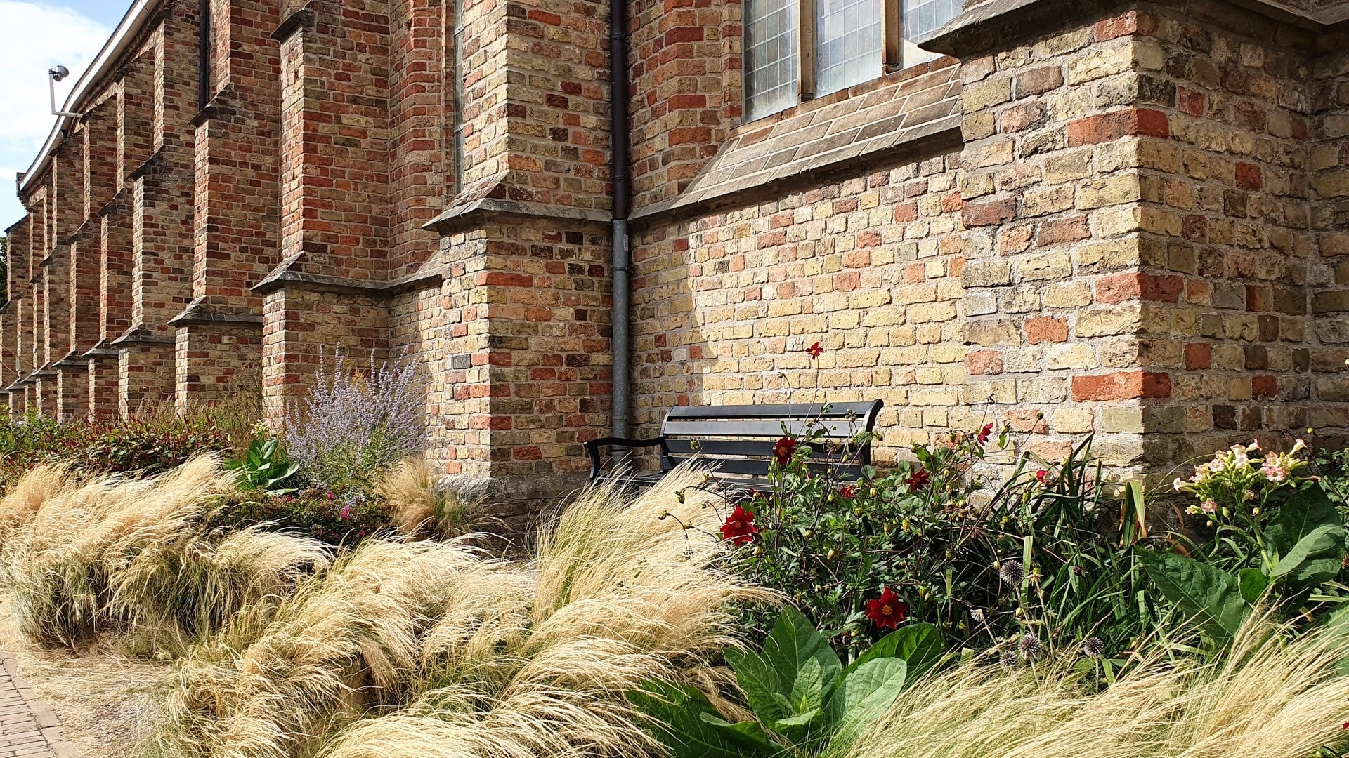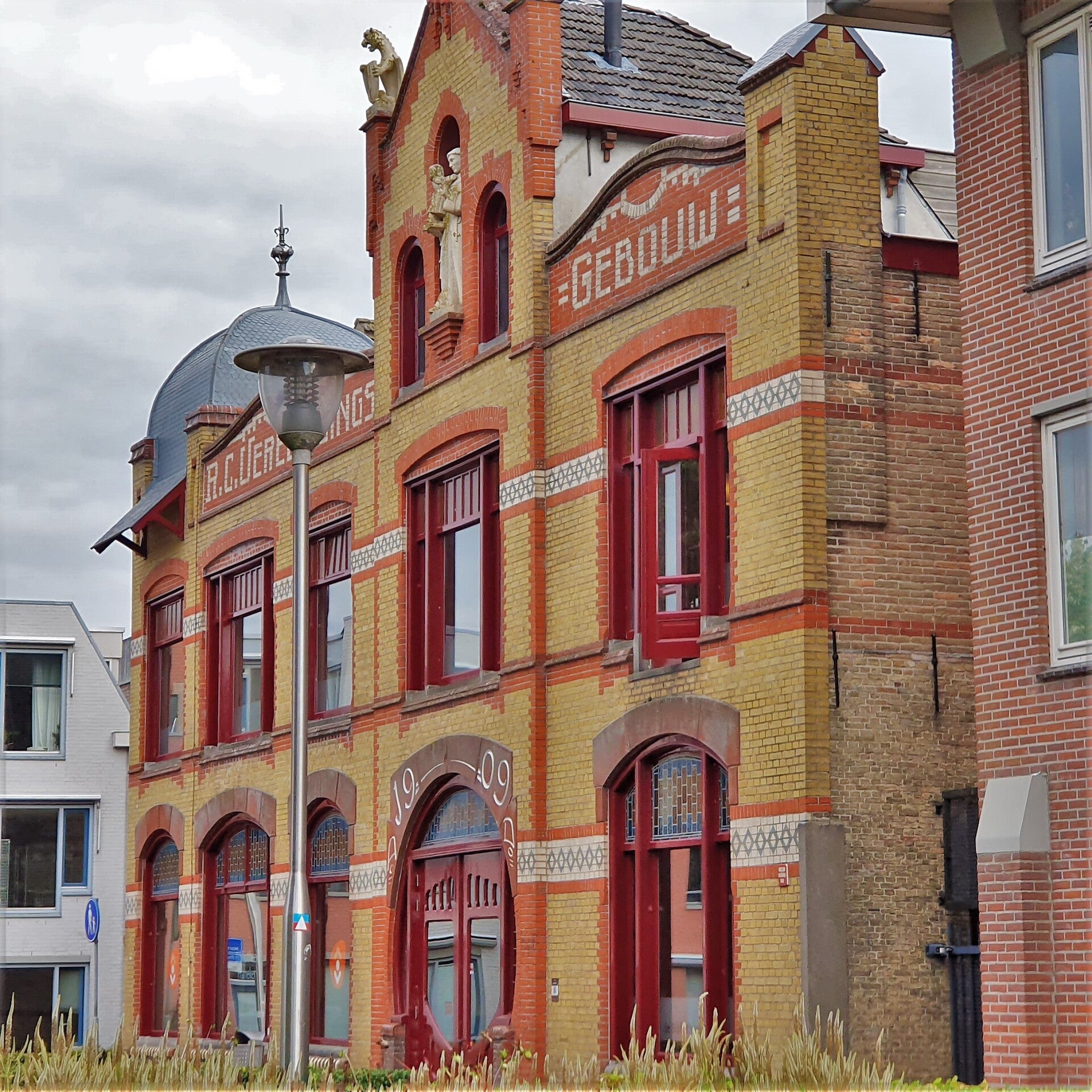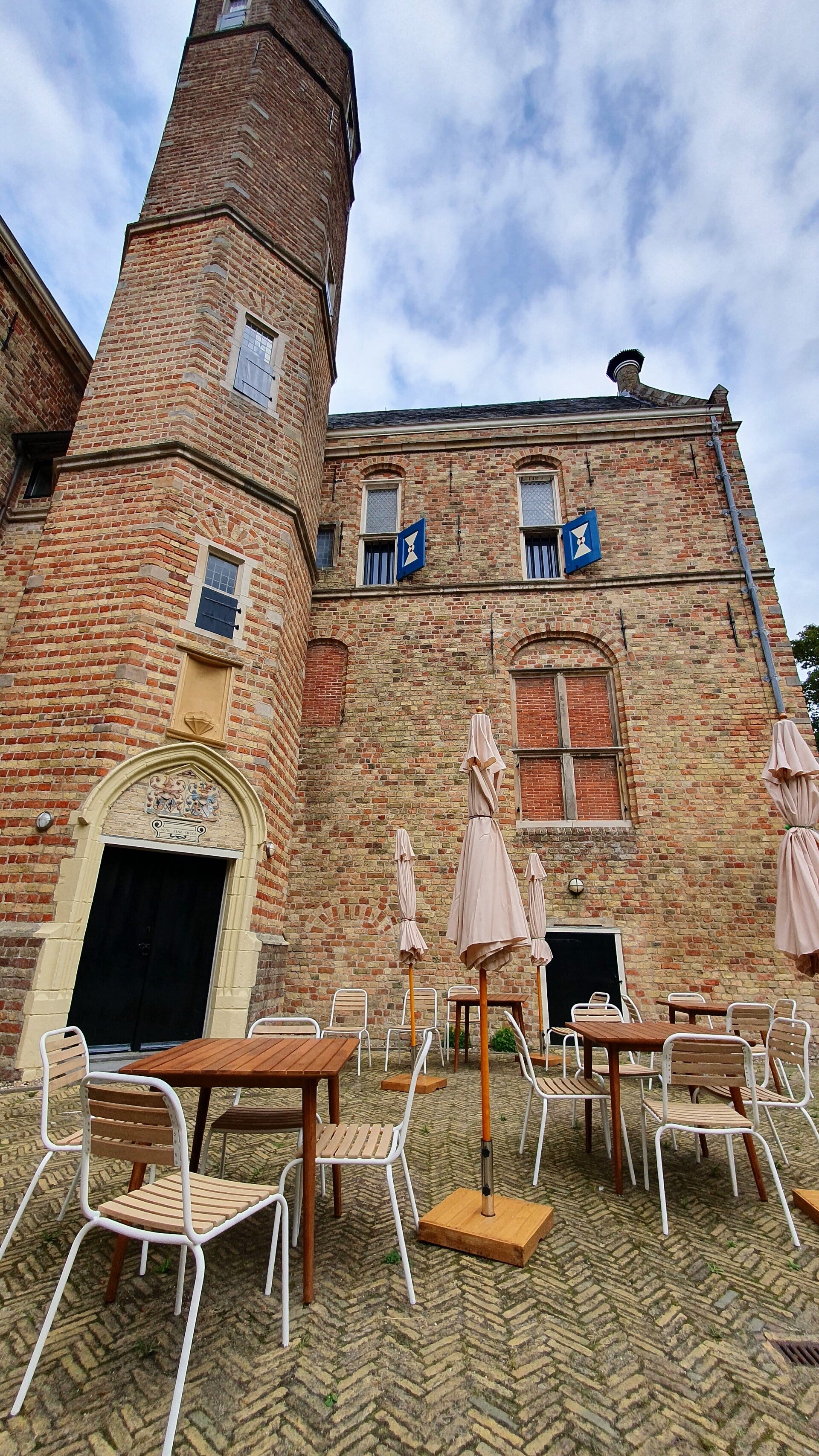 Na het onopvallende poortje komen we op het terrein en dan zien we het al. Dit is geen zuivere koffie, de hele boel ligt overhoop. Kennelijk wordt hier grondig onderhoud gepleegd. Overal steigers, werktuigen en bouwmaterialen. En een schaftkeet. De hoofdingang van het gebouw staat wagenwijd open, een blok beton houdt de deur op zijn plek. Als we dichterbij komen, zien we dat ook de hal bezaaid ligt met hout en gereedschap. Hier wordt gewerkt, maar nu even niet, er is geen bouwvakker te bekennen. 't Zal wel schafttijd zijn.