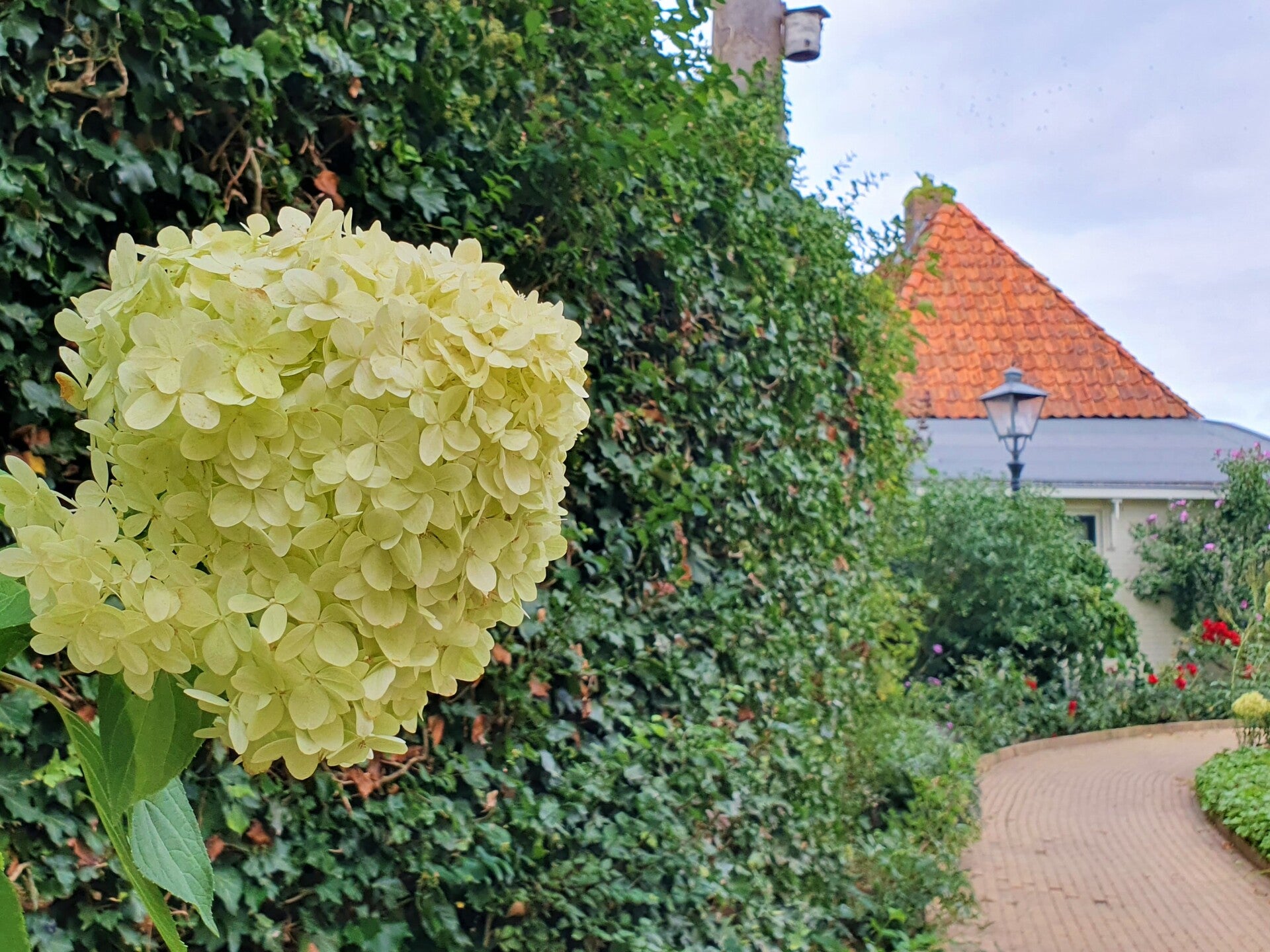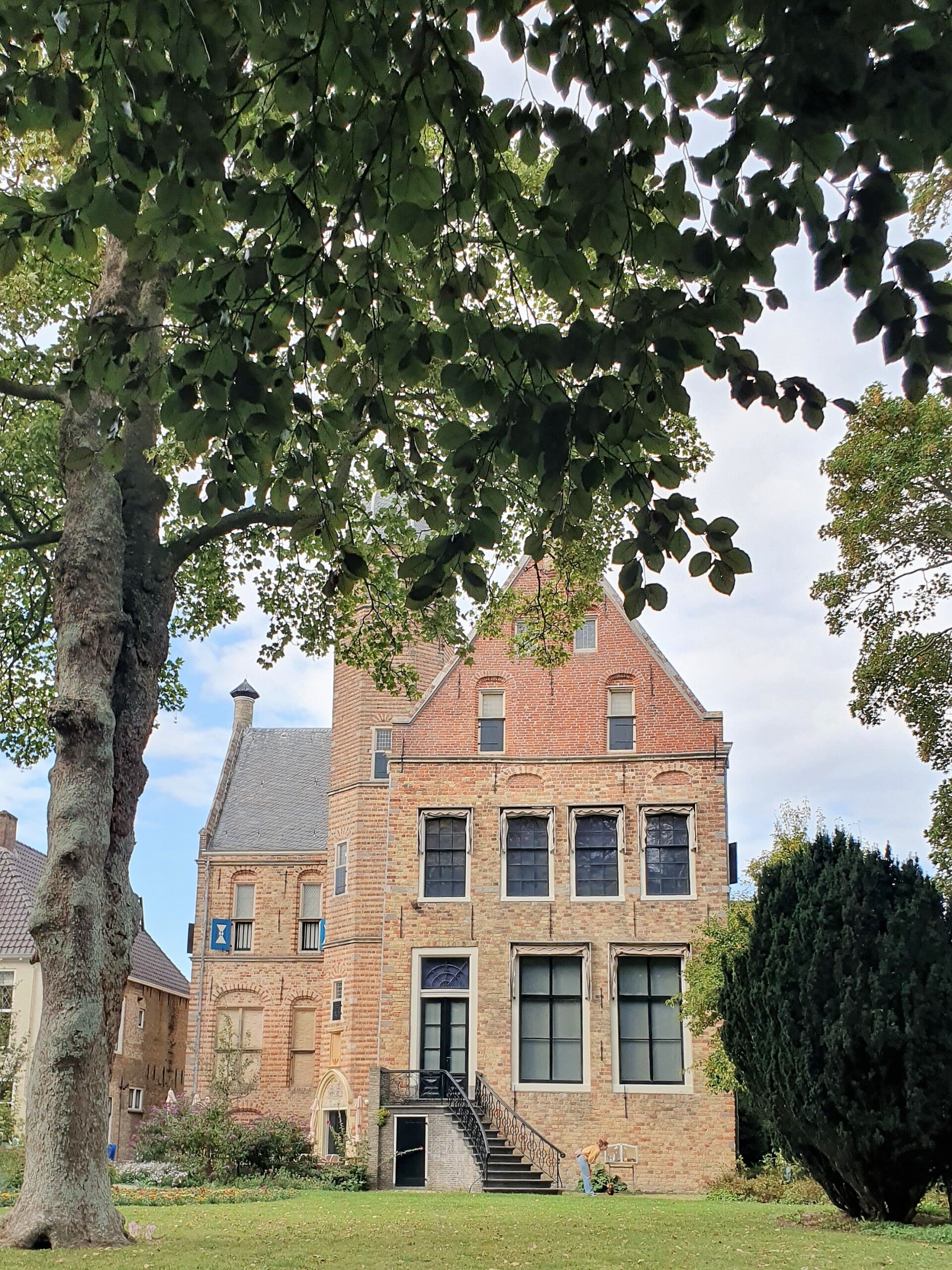 In de middag maken we ons op voor een struintocht langs monumenten en door open tuinen en verborgen hofjes van de stad. De werklui beneden hebben hun biezen al gepakt, dus G en W moeten maar samen proberen de rolstoel en mij weer de gang op te krijgen. Dat lukt wonderwel, maar na de eerste afslag stranden we alsnog halverwege de galerij.