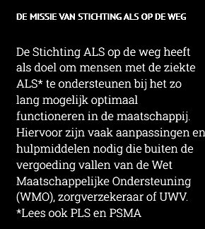 (Voor de niet ingewijden: in ALS-kringen is de stichting ALS op de weg een niet meer weg te denken speler, zie kader. Mede dankzij giften en legaten én de Glazen Huisactie 2023 kunnen zij hulpmiddelen aanschaffen die aan patiënten tijdelijk uitgeleend kunnen worden.)